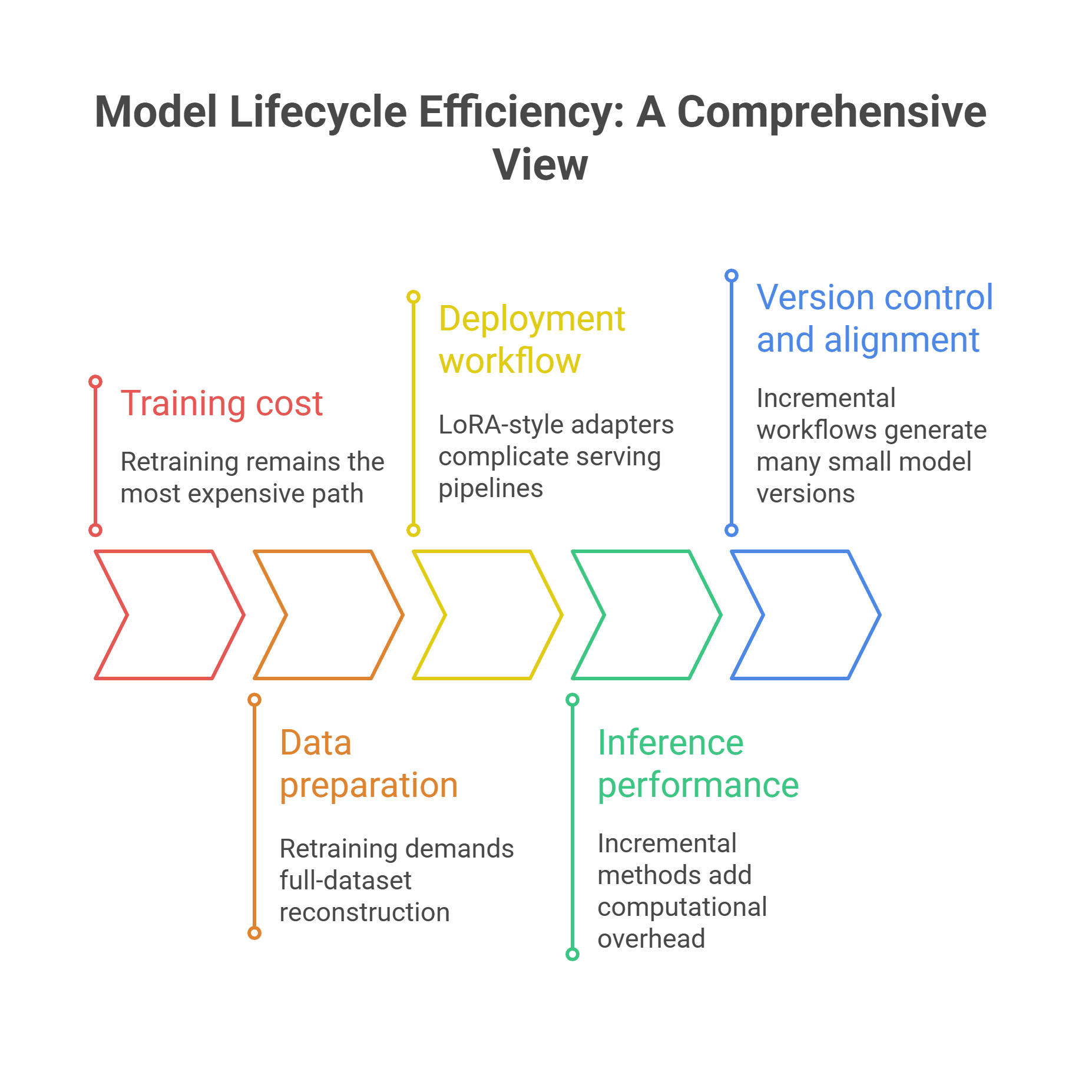 Teams often compare retraining and incremental learning by looking only at training cost – but this is a narrow view. True efficiency spans the entire model lifecycle: data, training, evaluation, deployment and inference.