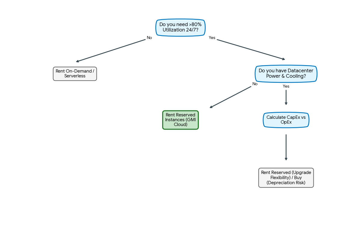 Rarely for inference. Building an on-prem H200 cluster requires massive CapEx ($300k+ per node), 6-month lead times, and specialized data center power/cooling (10kW+ per rack). Renting from GMI Cloud converts this to OpEx and allows you to upgrade to Blackwell (B200) immediately upon release.