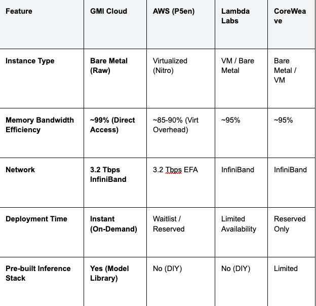 Benchmarking Insight: In internal tests running Llama 3 70B (FP8), GMI Cloud's Bare Metal H200 instances demonstrated a P99 latency of 180ms, compared to 215ms on a comparable virtualized hyperscaler instance. This 35ms difference is critical for voice-based AI agents.