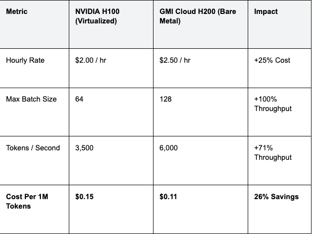 Is the H200 worth the premium? While the hourly rental rate is higher than the H100, the TCO per token is often lower.