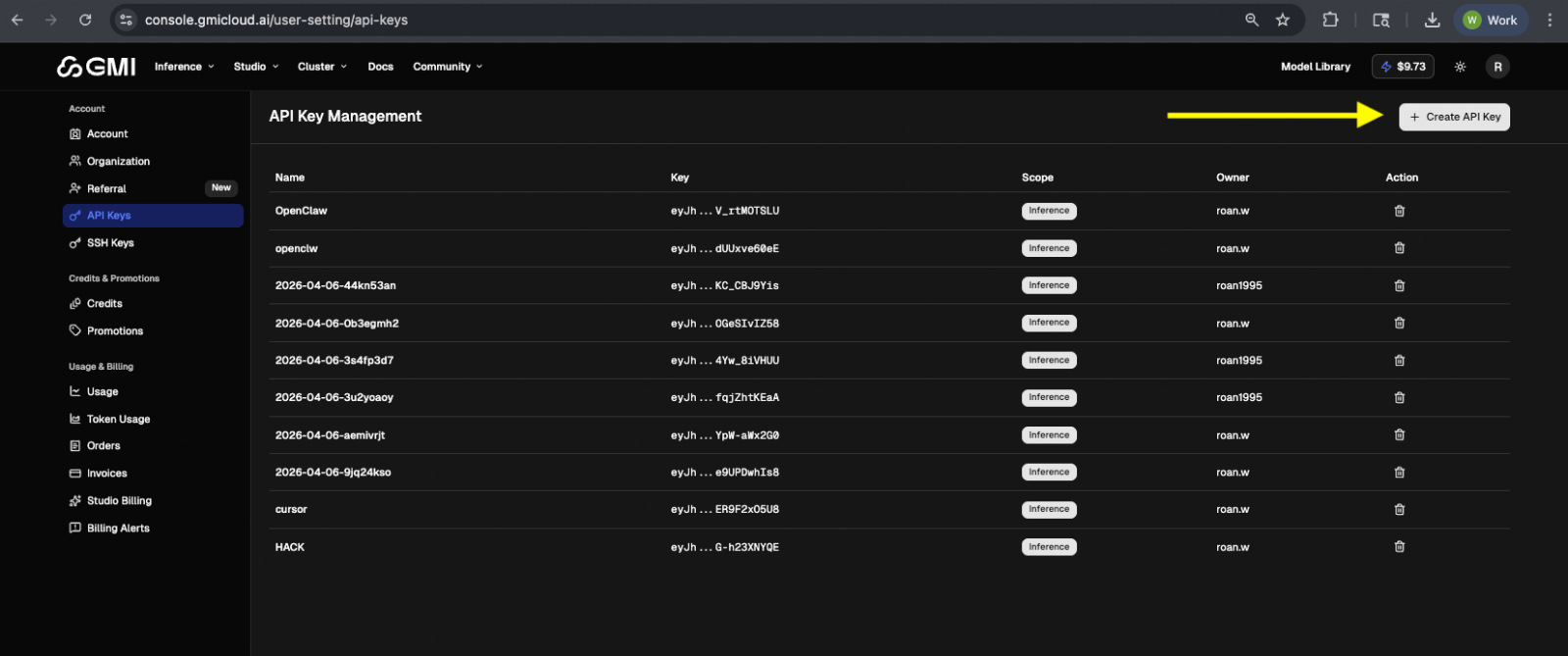 To connect OpenClaw to GMI Cloud, first create an API key in the GMI Cloud Console. Sign in at console.gmicloud.ai, go to API Key, and click Create API Key. Once the key is generated, copy it and save it securely, since this is the credential you will use to configure the plugin through an environment variable or the onboarding flow. After that, your OpenClaw setup will be ready to use GMI models directly inside the interface.