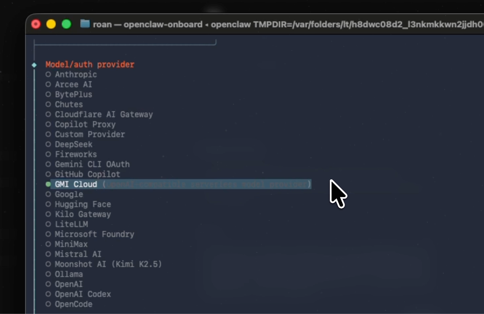 After installation and onboarding, GMI appears in the provider list inside OpenClaw. From there, you can browse available models and choose the one that fits your use case.