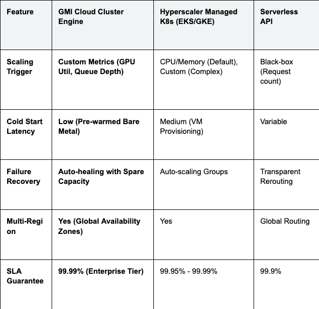 Engineering Insight: GMI Cloud's Cluster Engine allows for "Scale-to-Zero" for development workloads to save costs, while offering "Standby Replicas" for production workloads to ensure zero cold-start latency during traffic spikes.