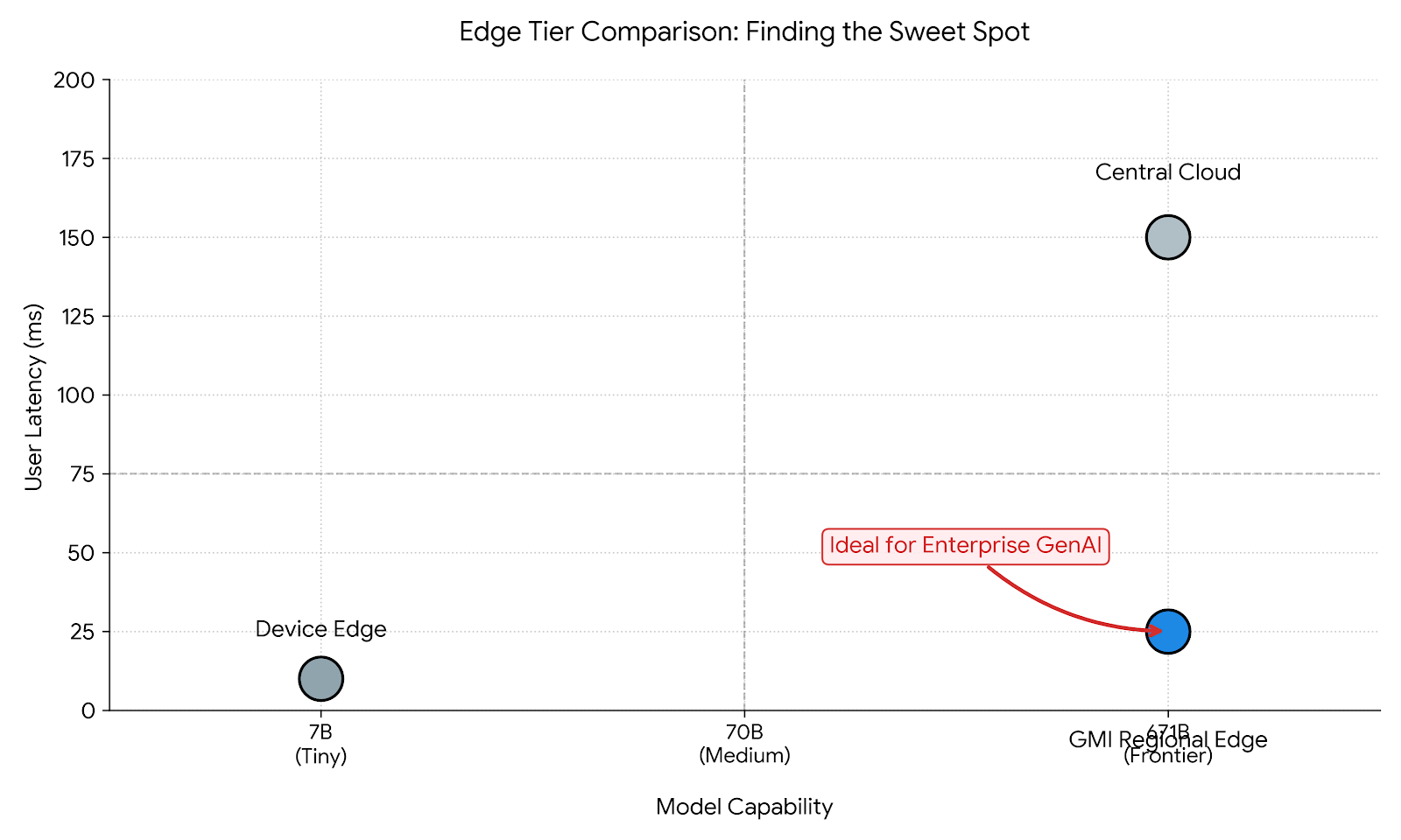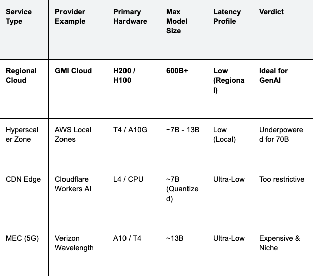 Strategic Pivot: For 90% of enterprise GenAI use cases, Tier 3 (Regional Cloud Edge) is the only viable option. Users expect GPT-4 level intelligence, which requires massive GPUs that only exist in data centers. The goal is to move those data centers closer to the user.